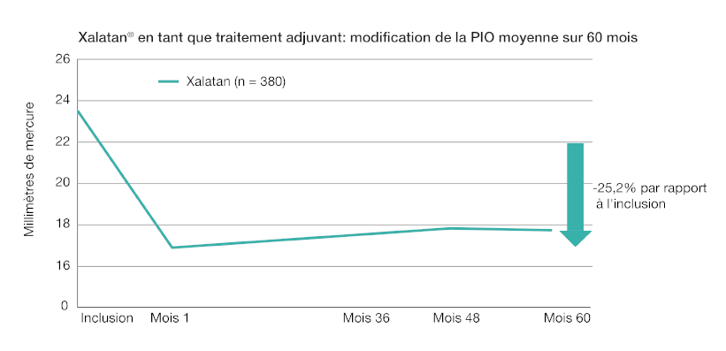 En tant que traitement adjuvant, Xalatan® a maintenu la réduction de la PIO pendant plus de 5 ans2.