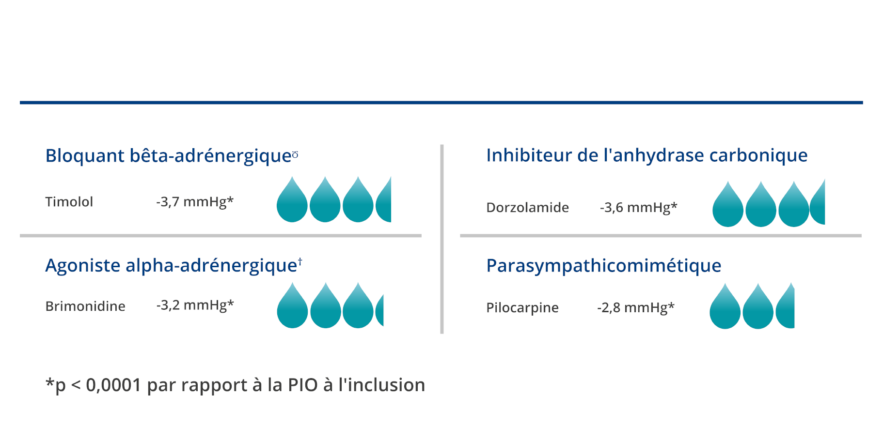 Les autres bloquants bêta-adrénergiques étudiés étaient le lévobunolol (-3,5 mmHg), le métipranolol (-3,3 mmHg), le bétaxolol (-4,5 mmHg) et le cartéolol (-4,3 mmHg)4.
